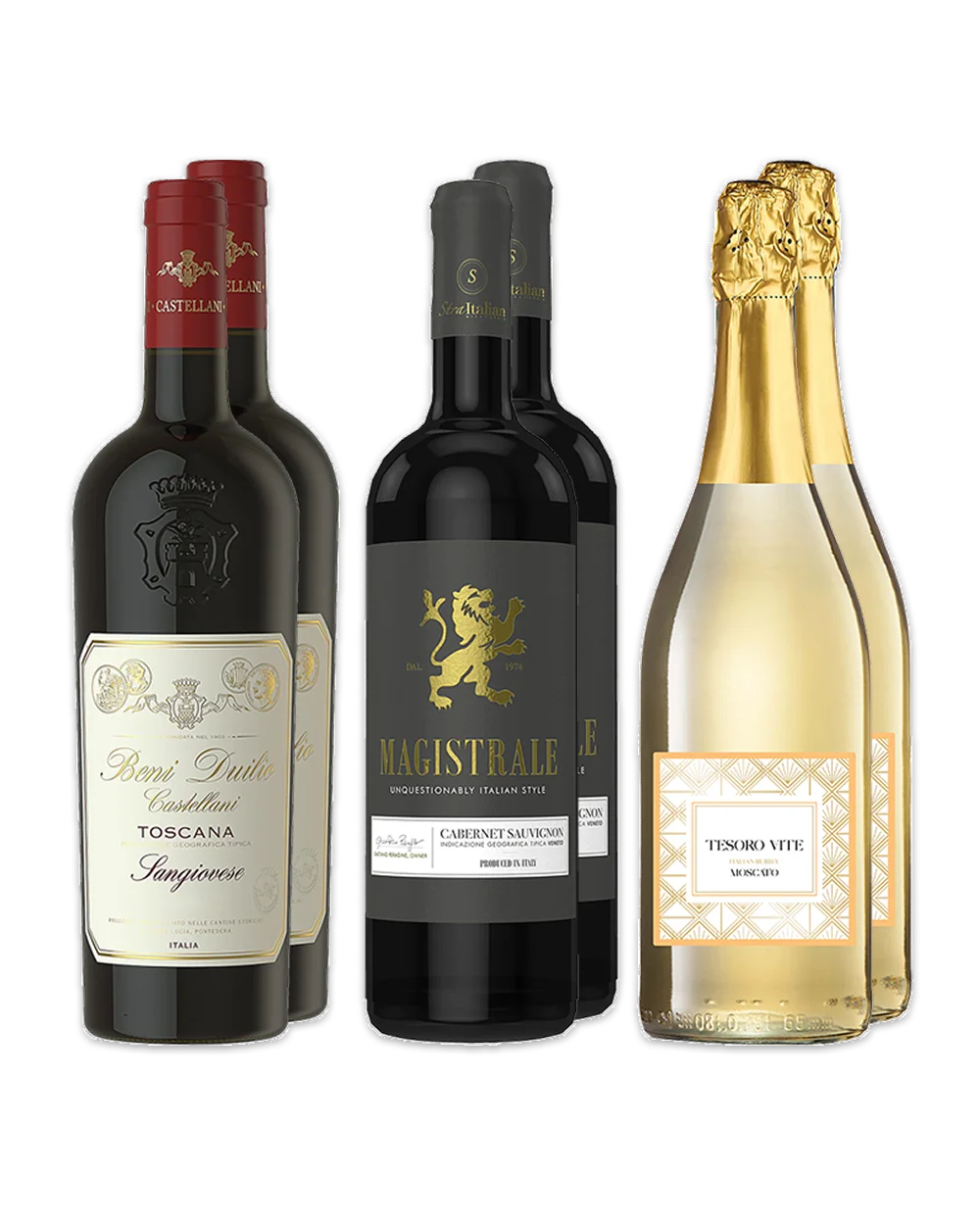 Double the Italian excellence, double the enjoyment. This six-bottle collection gives you two of each award-winning Italian wine—Tuscan Sangiovese, Venetian Cabernet Sauvignon, and Piedmont Sparkling Moscato. Perfect for hosting Italian-themed dinners, sharing with friends, or simply ensuring you always have these proven favorites on hand. Each wine has earned medals for its quality, representing authentic Italian winemaking from three distinct regions. Whether you're a confirmed Italophile or building your Italian wine knowledge, this collection delivers variety and reliability in equal measure.
